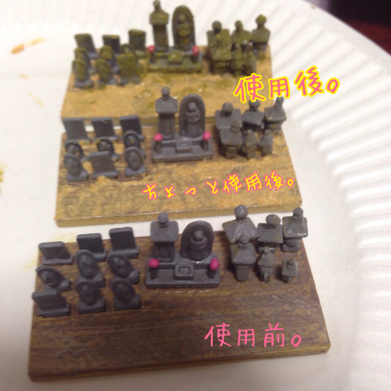 全く組み立てただけのもの、地面のみ塗ったもの、苔たもの。